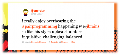 For the last three days our crew at the Energy Lab has been working on a small internal project with guest appearance from J. B. Rainsberger. There are always plenty of opportunities to learn in the lab and pairing with jbrains was certainly such occasion.